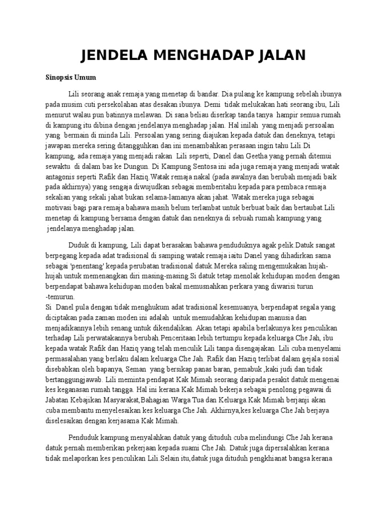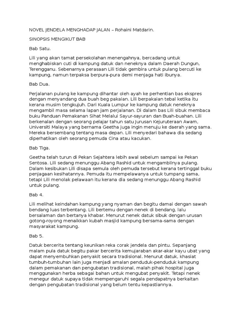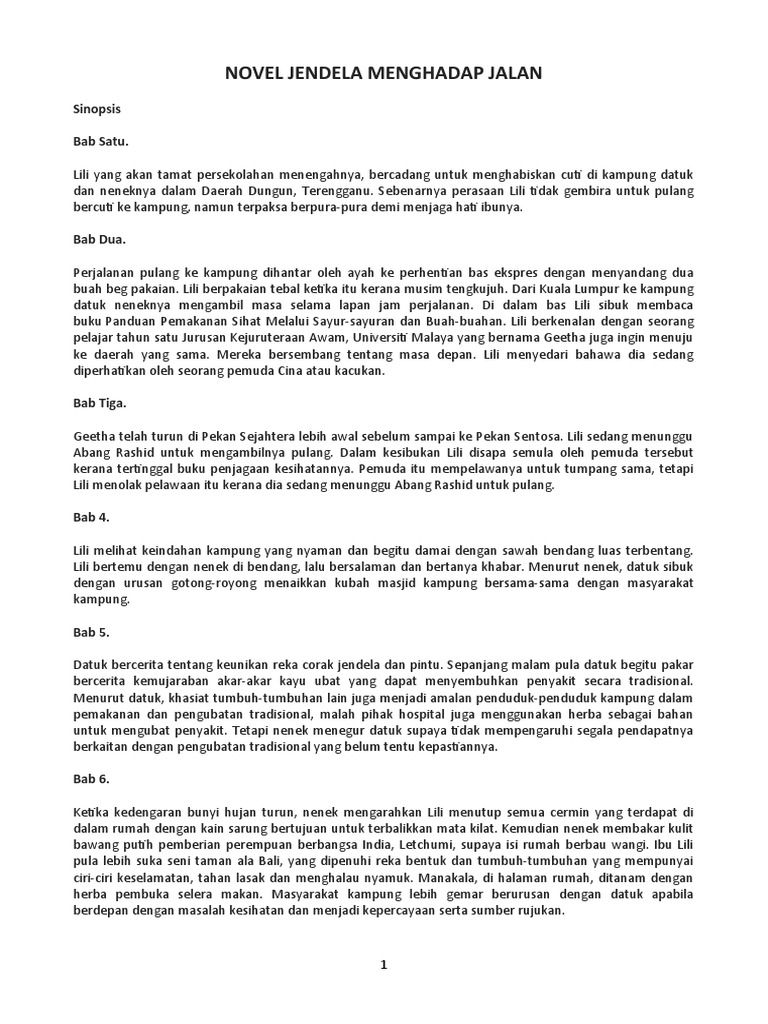 Walaupun dia tidak gembira dengan percutiannya pada kali ini namun dia ikutkan sahaja kehendak ibunya supaya ibunya tidak berasa kecil hati. NOVEL JENDELA MENGHADAP JALAN Bab 1 Lili yang akan tamat persekolahan menengahnya bercadang untuk menghabiskan cuti di kampung datuk dan neneknya dalam Daerah Dungun Terengganu. Latar tempat yang pertama adalah di Pekan Sentosa.